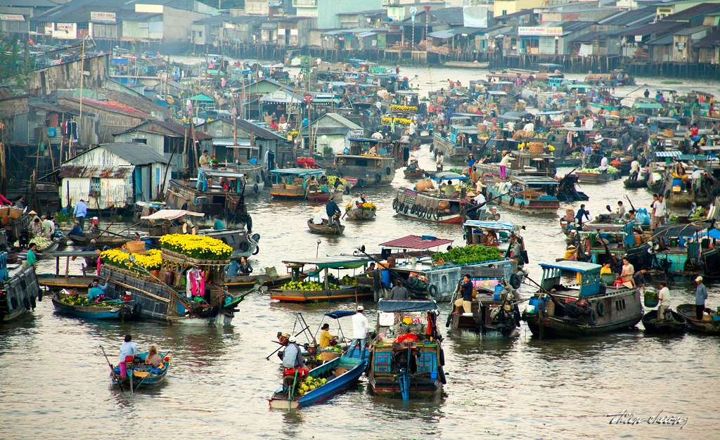 Tất cả hàng hóa từ trái cây, hàng tiêu dùng cho đến các quán ăn đều được bày trên thuyền, trên ghe. Cùng với tiếng sóng vỗ vào mạn thuyền, cùng với tiếng chào mời và khung trời man mát của buổi sáng sớm, không cần bất kì người họa sĩ nào tô vẽ bức tranh cuộc sống đời thường của người dân nơi đây cũng đã hiện lên vô cùng sống động. Thử trải nghiệm ngồi chênh vênh trên thuyền, ăn một tô bún mắm xem, bạn sẽ thấy cuộc sống này thú vị biết bao.